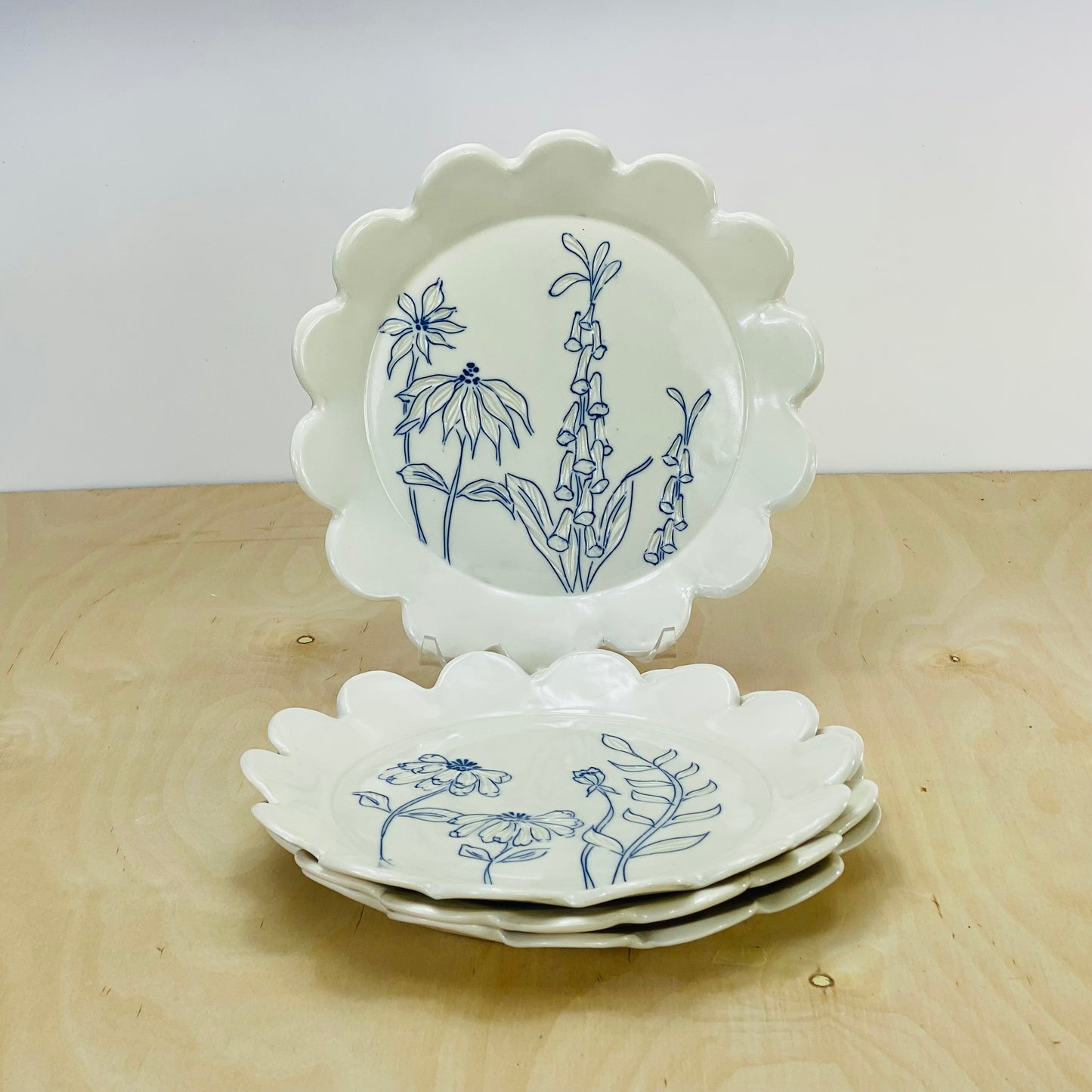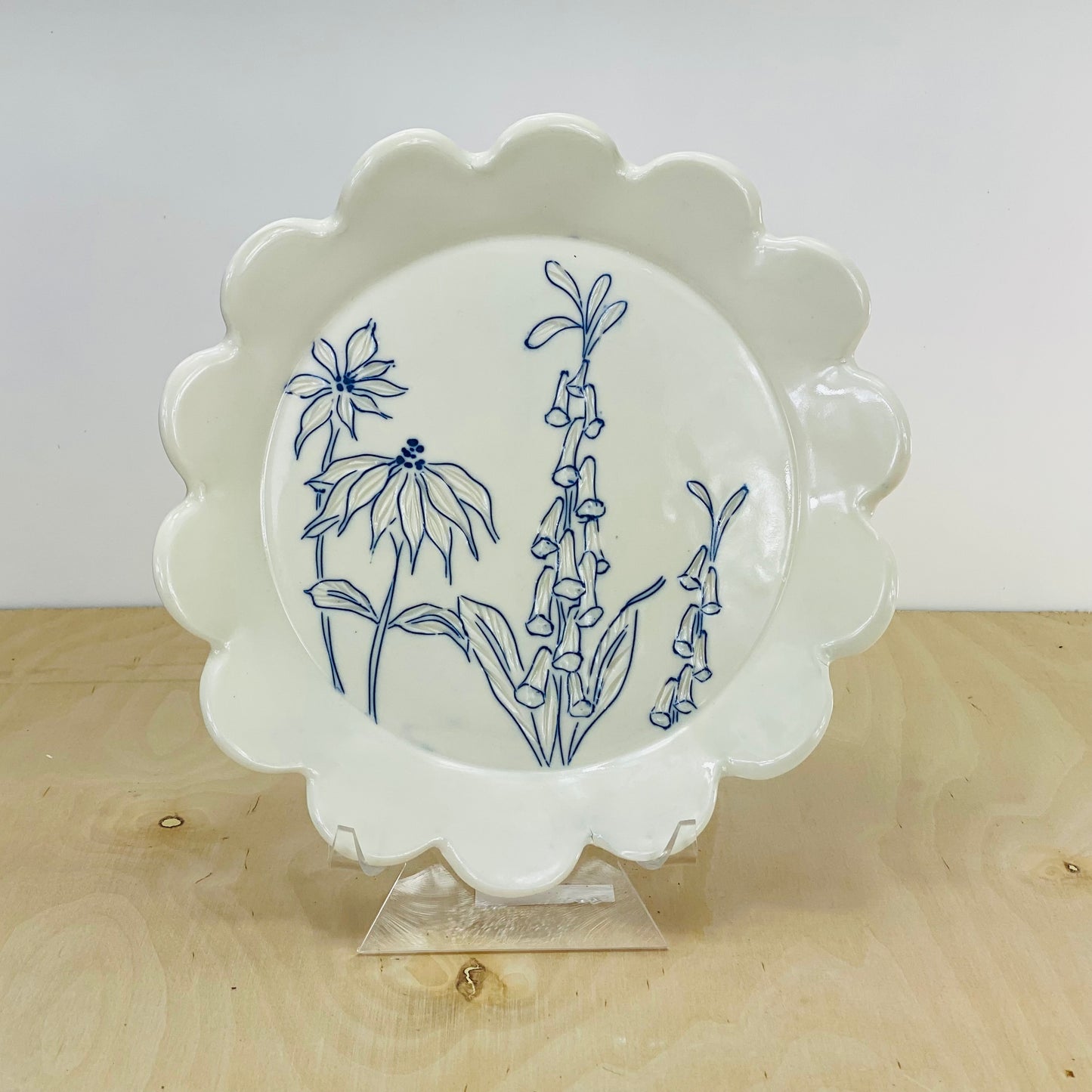- Porcelain, wheel thrown, hand drawn using inlay technique, cone 9 oxidation