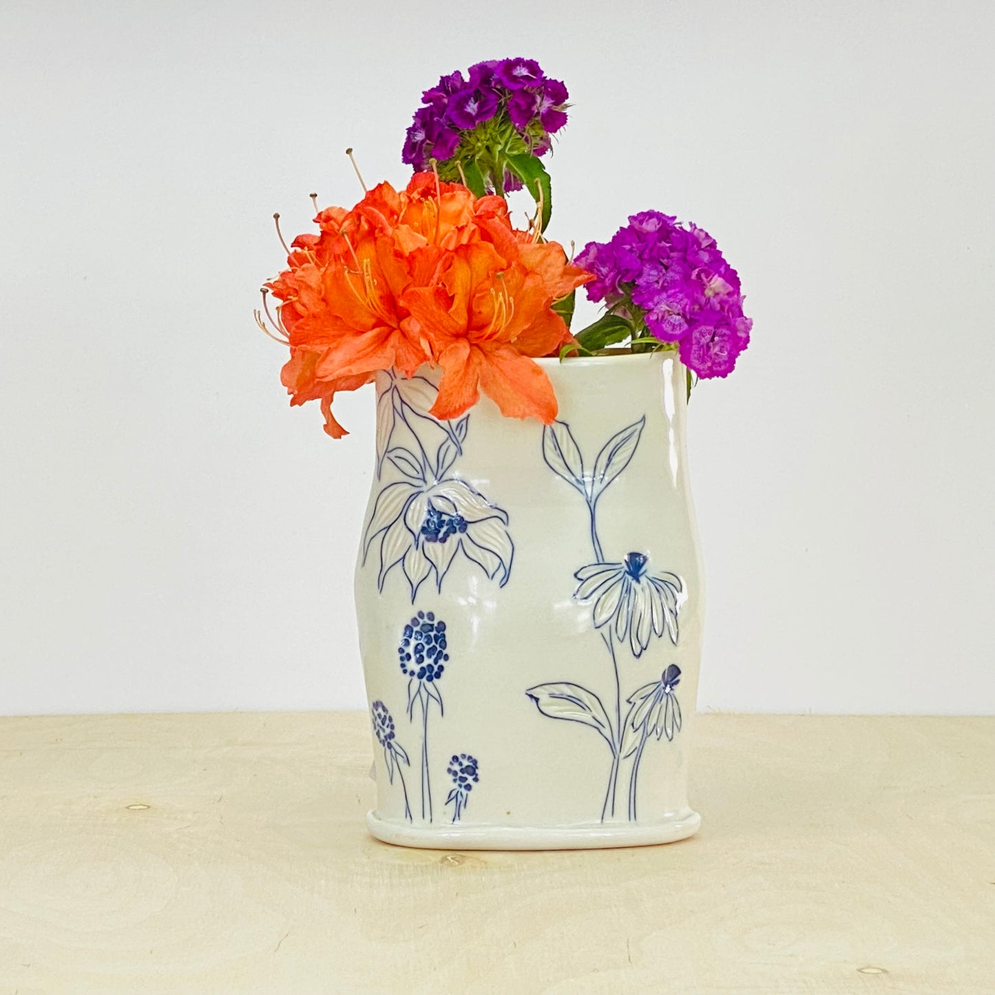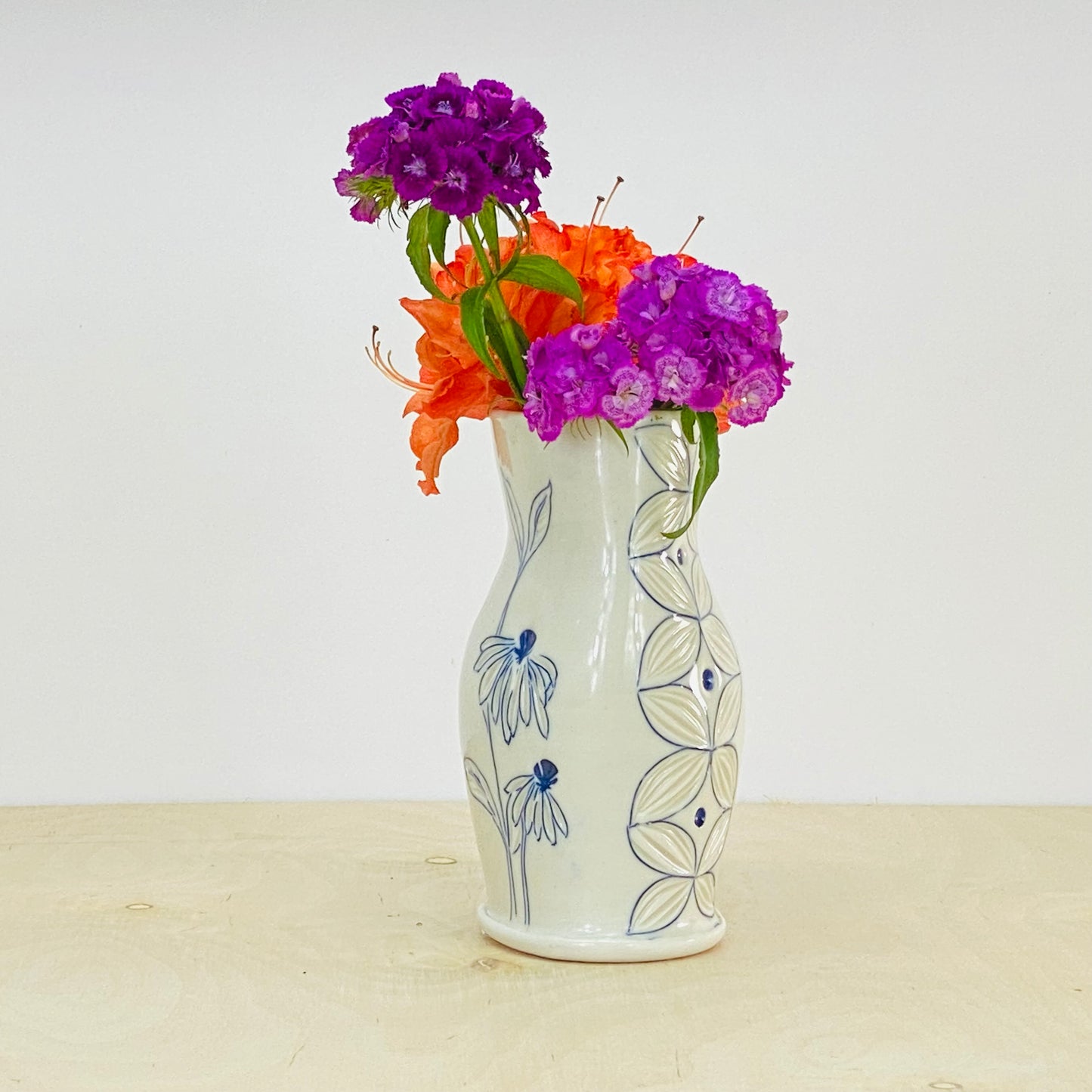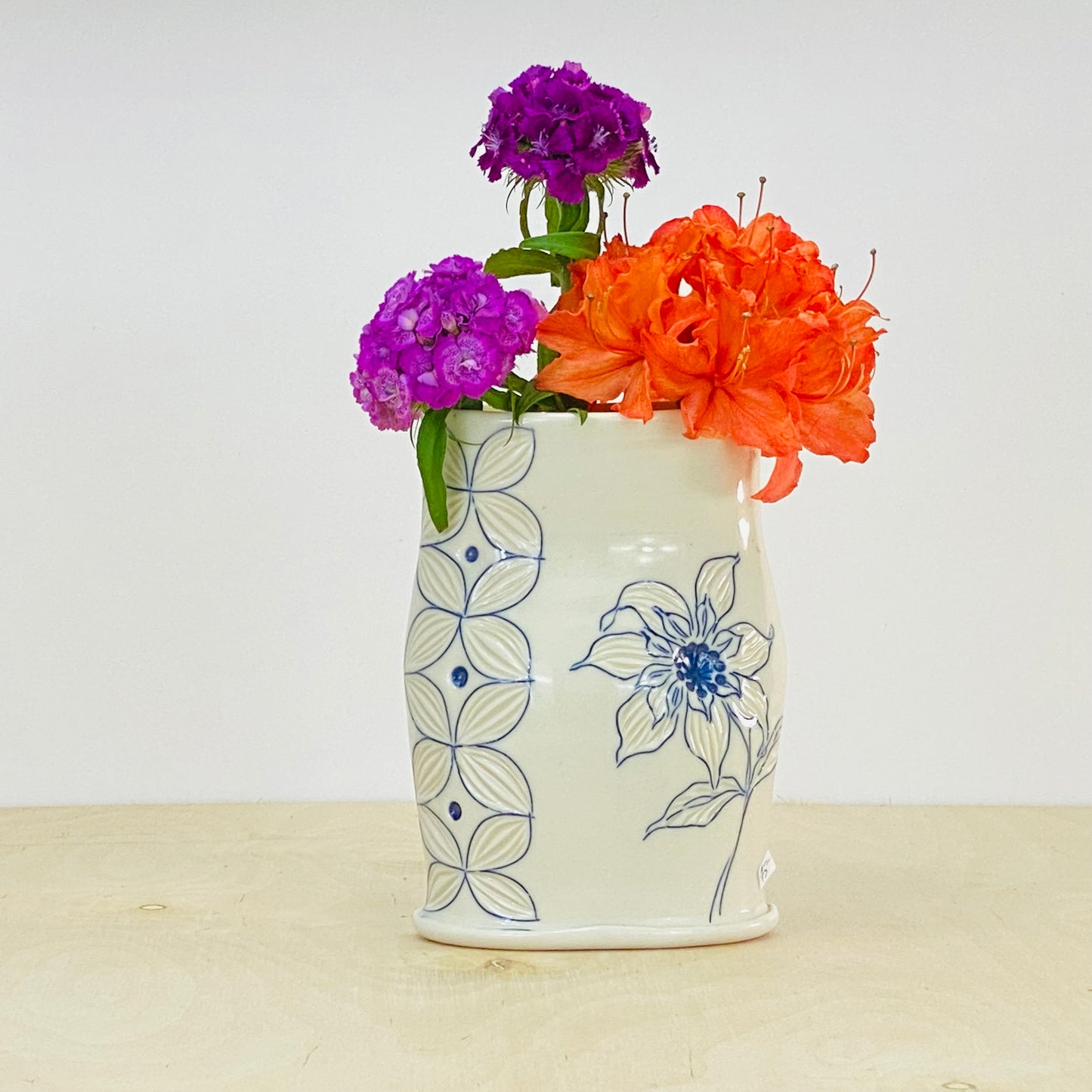 - Porcelain, wheel thrown, altered, hand drawn using inlay technique, cone 9 oxidation